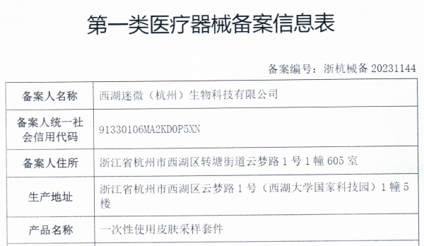 在2023年度即將完美收官之際,我公司自行研制的一次性使用皮膚采樣套件獲得杭州市市場(chǎng)監(jiān)督管理局的第一類(lèi)醫(yī)療器械備案許可,西湖迷微首個(gè)醫(yī)療器械產(chǎn)品正式獲批上市!