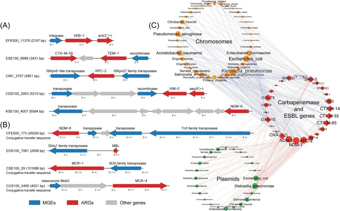 圖3. 項目組從污水樣本中獲取超廣譜抗生素耐藥表型微生物耐藥基因和可移動基因元件的排列信息(A)和(B),其宿主細菌與臨床致病細菌之間共享了完全相同的超廣譜抗生素耐藥基因(C)。