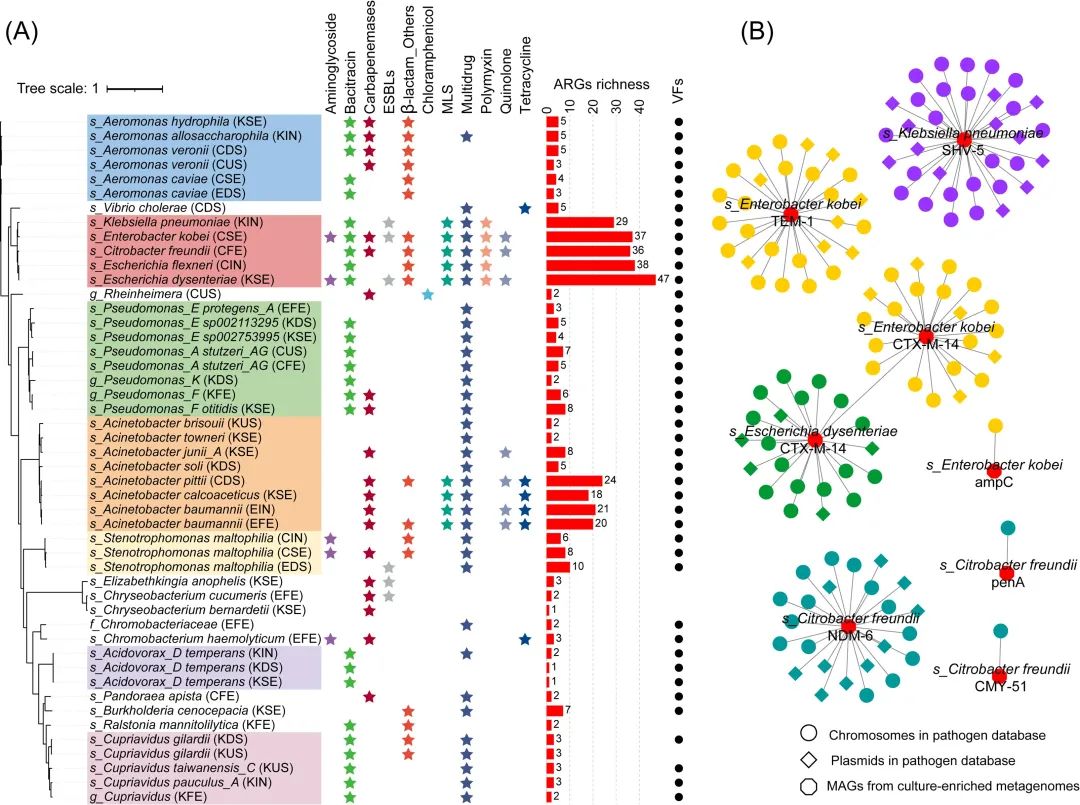 圖4. 項目組從某城市污水廠檢出具有超廣譜抗生素耐藥表型的48個高質(zhì)量耐藥細菌基因組的系統(tǒng)發(fā)育關系和耐藥圖譜(A),以及其與已知臨床致病細菌之間大量共享完全相同超廣譜抗生素耐藥基因(B)。