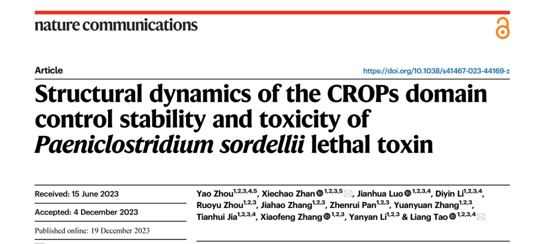 北京時(shí)間2023年12月19日,陶亮團(tuán)隊(duì)與合作者在Nature Communications上在線(xiàn)發(fā)表題為“Structural dynamics of CROPs control the stability and toxicity of Paeniclostridium sordellii lethal toxin”的研究論文(圖1),揭示了TcsL的組合重復(fù)寡肽區(qū)域具有調(diào)控毒素自剪切和毒性的功能,并從生化、細(xì)胞和結(jié)構(gòu)層面闡述了其工作機(jī)制;研究還進(jìn)一步發(fā)現(xiàn)這種自調(diào)控機(jī)制在其它大梭菌毒素家族成員中也可能普遍存在。